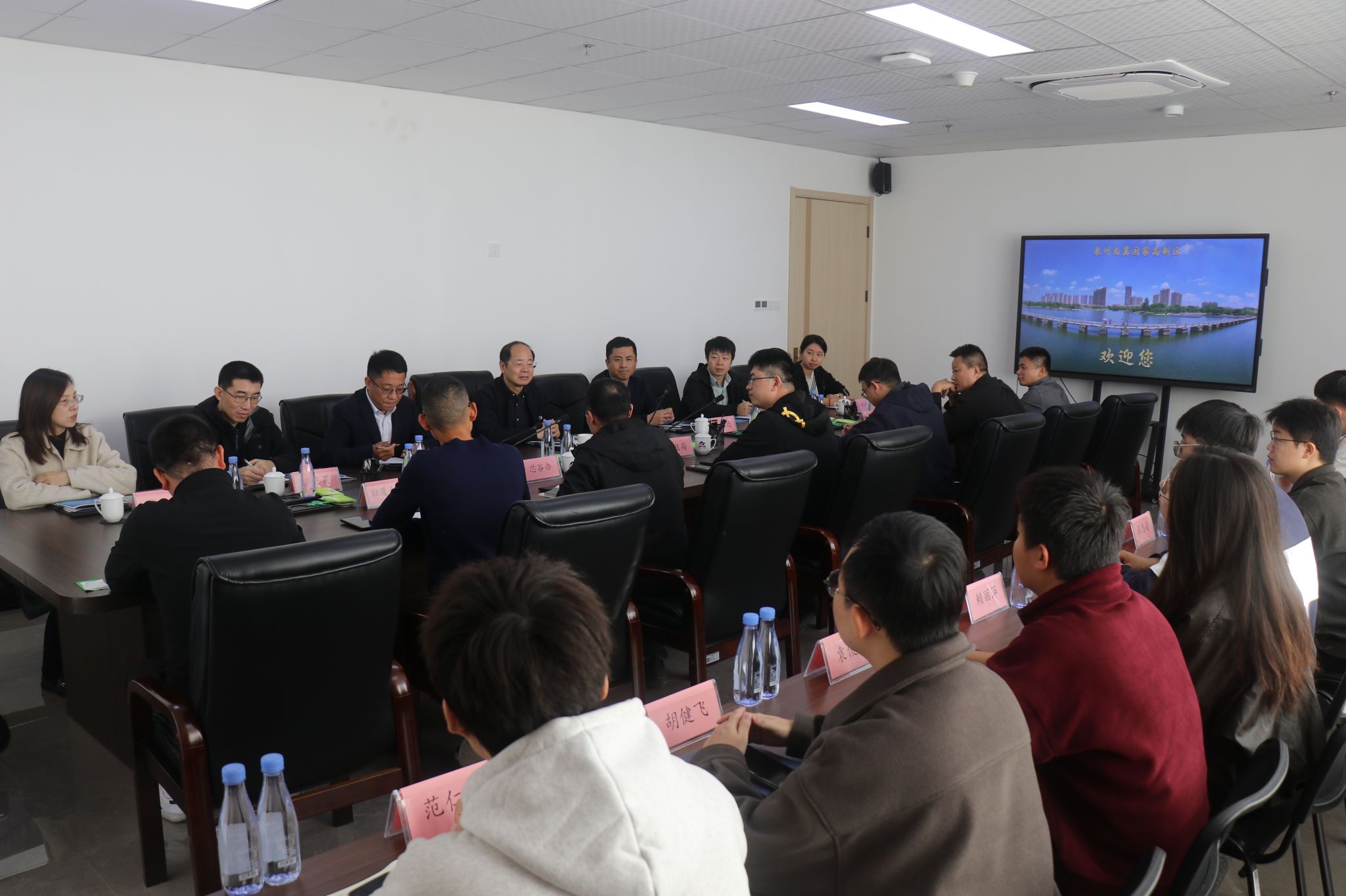随后,刘立荣书记一行与南安市一行召开座谈会,会上充分了解了芯谷园区的发展布局、产业基础、人才政策等核心情况。泉州芯谷南安分园区区位独特、平台完备、政策务实,既具备承接高校科研成果的产业基础,又能为技术落地转化提供全链条支撑,刘立荣书记一行希望与泉州芯谷南安分园区持续深化校地合作,以科研创新赋能地方经济高质量发展。会上,双方还围绕产学研深度融合、科研成果转化路径、人才联合培养模式等关键议题深入探讨。